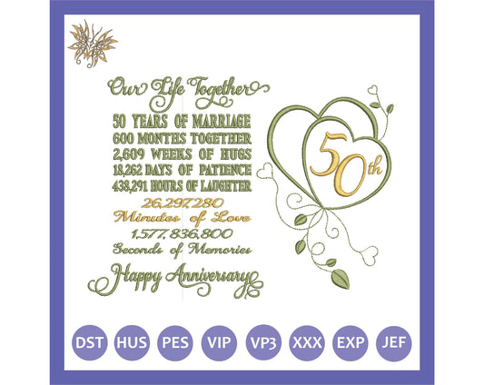 50th Anniversary Machine Embroidery Design for DIY Gift to frame for Mom, Parent, or Spouse. 3 sizes, 8 formats INSTANT DOWNLOAD