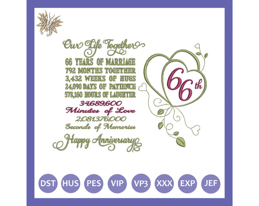 66th Anniversary Machine Embroidery Design for DIY Gift to frame for Mom, Parent, or Spouse. 3 sizes, 8 formats INSTANT DOWNLOAD
