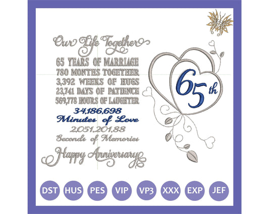 65th Anniversary Machine Embroidery Design for DIY Gift to frame for Mom, Parent, or Spouse. 3 sizes, 8 formats INSTANT DOWNLOAD