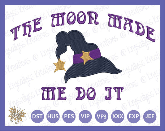 Witch Hat with Saying Machine Embroidery Design in 3 sizes, 8 formats, The Moon Made Me Do It Witchcraft Moon Decor, INSTANT DOWNLOAD