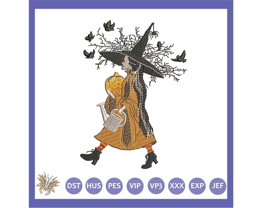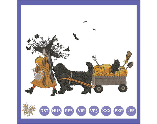 Witches Garden Machine Embroidery Design in 1 size and 8 formats, Autumn Pumpkins with dog and black cat All things Witchy, INSTANT DOWNLOAD