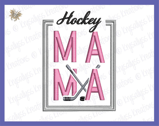 Hockey MaMa Machine Embroidery Design File for 4x4 hoop. Sized for left chest or sleeve of a jacket or sweatshirt. Download now, 8 formats