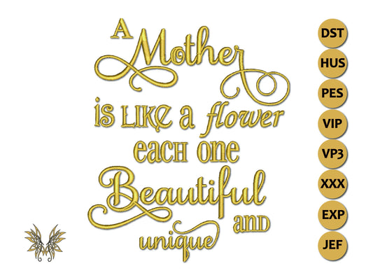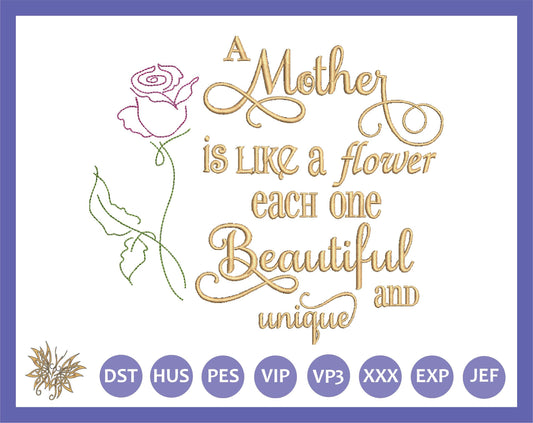 A Mother is Like a Flower Machine Embroidery Design for personalized gifting, DIY designs for Mother's Day gift in 3 sizes and 8 formats