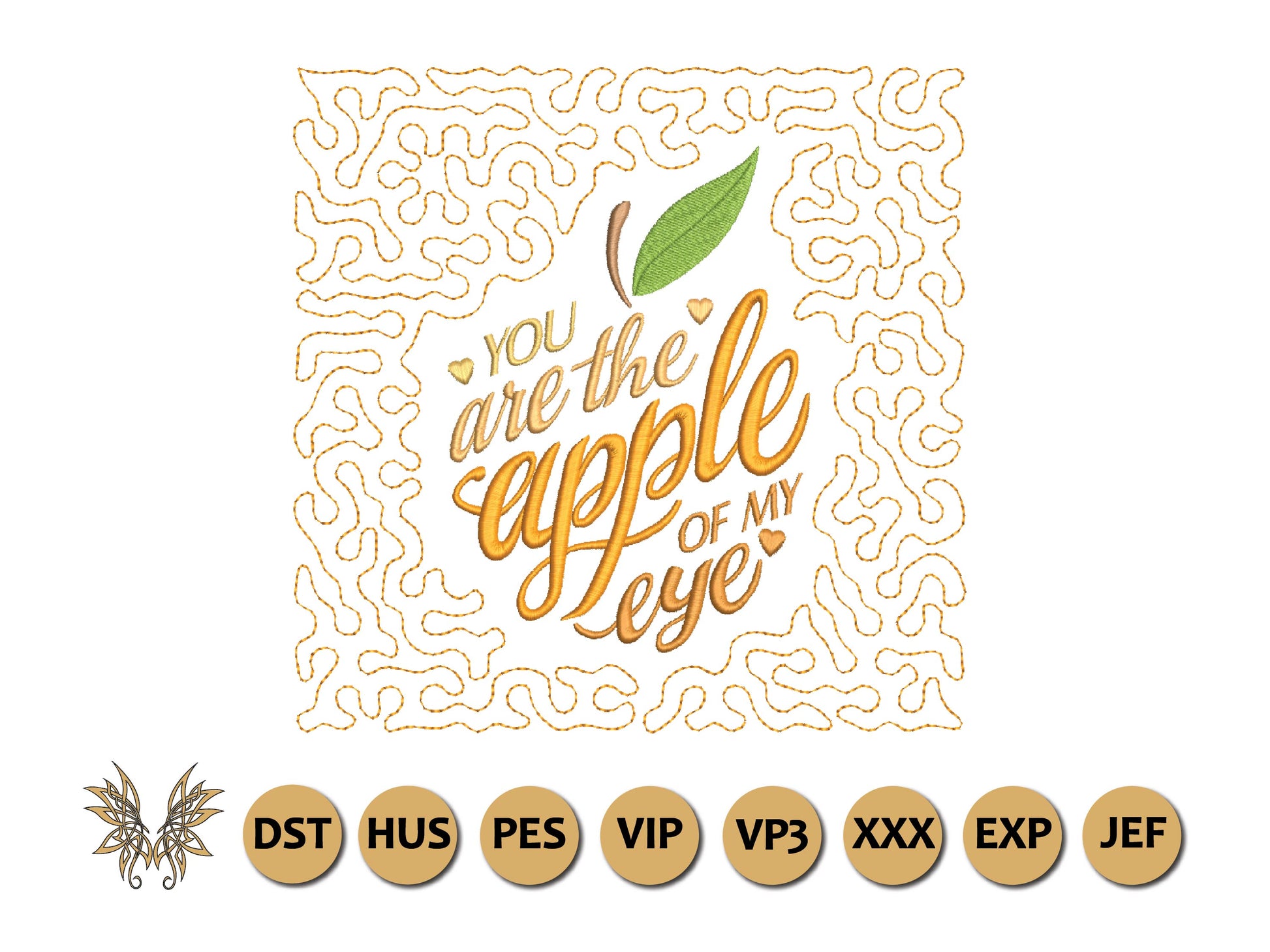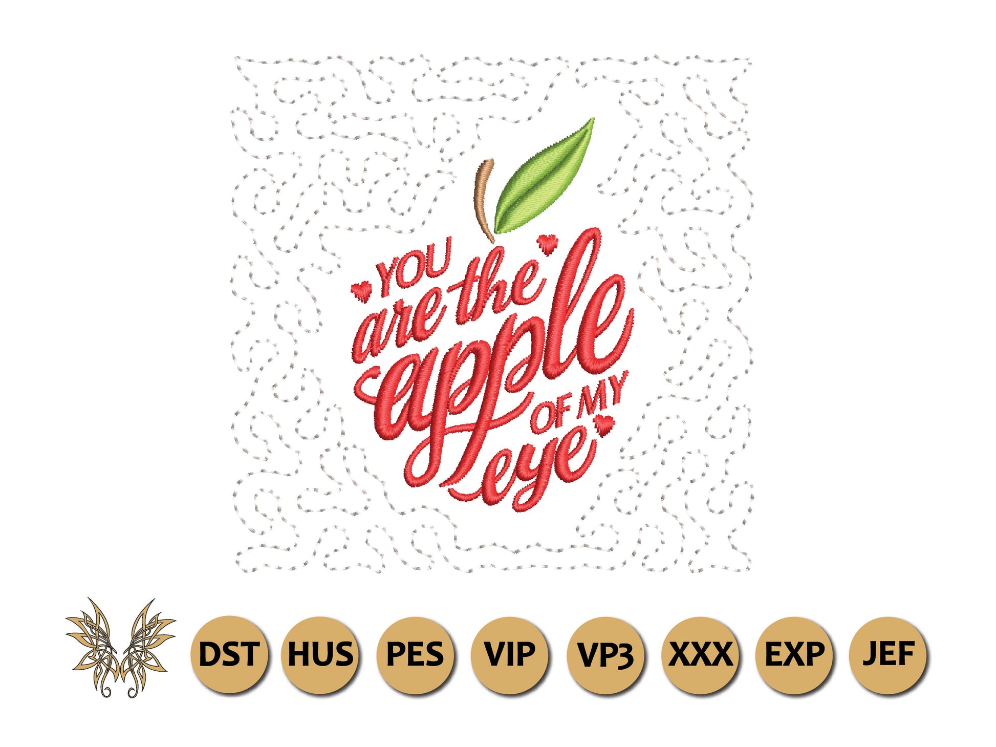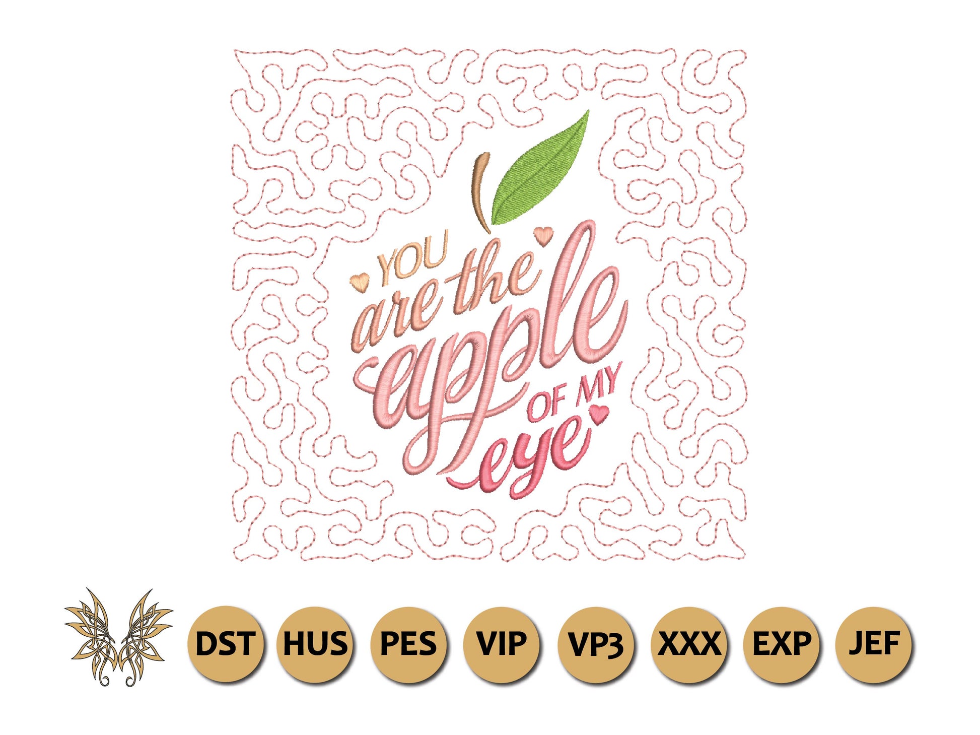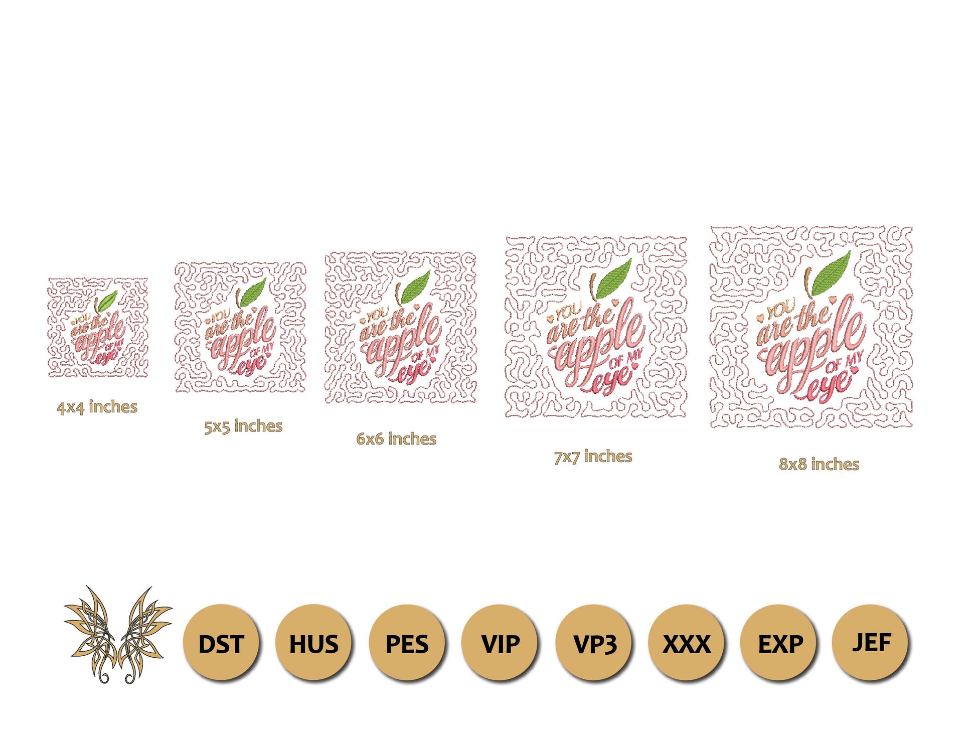 The following formats are included in the file you will receive: DST, EXP, HUS, JEF, PES, VIP, VP3, XXX