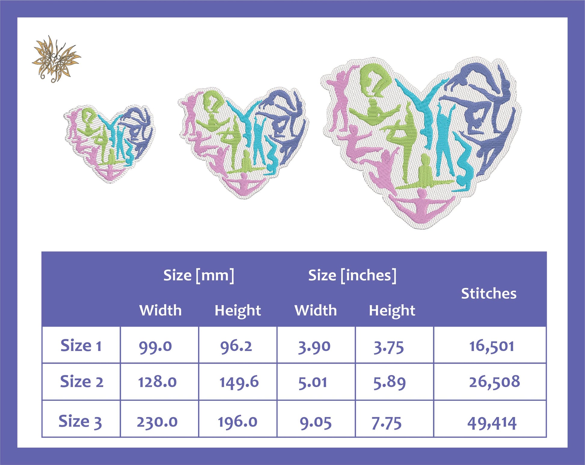 Gymnastics Heart Machine Embroidery Design File includes laydown for pile. Perfect Gymnast Lover Gift. 4x4, 5x7, 8x12 hoop sizes, 8 formats